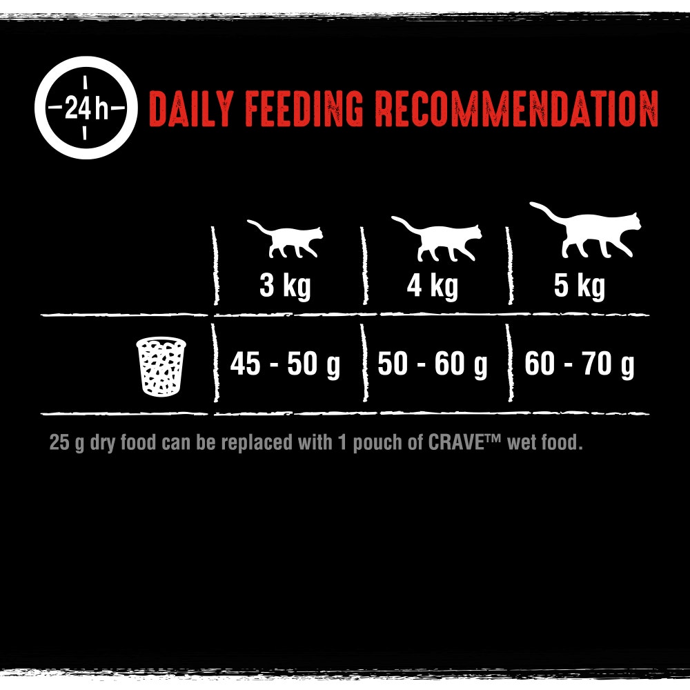 With a minimum of 100% animal sources, CRAVE™™ Adult Dry Cat Food is a healthy cat food inspired by a cat's natural diet. Produced as crunchy cat food, CRAVE™™ Feline Food is made with fresh meat for a high protein recipe. These protein-rich recipes support strong and healthy muscles for your cat and promote an active, energetic life.A high quality adult premium cat food, CRAVE Adult cat food is made with a minimum of 100% animal sources; a quality dry cat food you can rely on.CRAVE healthy cat food is made without grains, using high protein recipes with fresh meat to support strong and healthy muscles. This sensitive cat food has the taste and crunch your cat will CRAVE.CRAVE cat food is dry food , made without grains, for cats with sensitive digestions.CRAVE's sensitive cat food dry recipes are quality meals made with no artificial colours or preservatives.Maize, wheat, soya and dairy free, CRAVE Adult wet cat foods are high protein cat food for every day vitality and health.INGREDIENTS